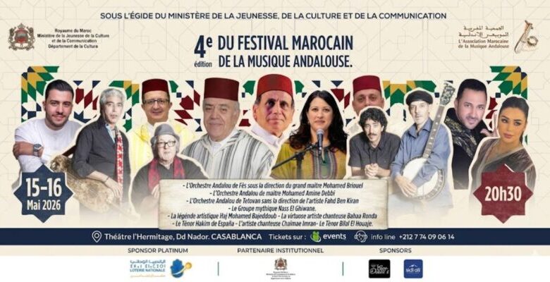 L’Association Marocaine de la Musique Andalouse (AMMA) a annoncé, dimanche, la 4ème édition du Festival Marocain de la Musique Andalouse (FMMA), prévue les 15 et 16 mai courant au Théâtre l’Hermitage à Casablanca, sous le thème « La culture, levier de développement et de rayonnement durable ».